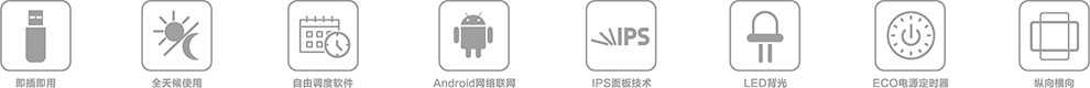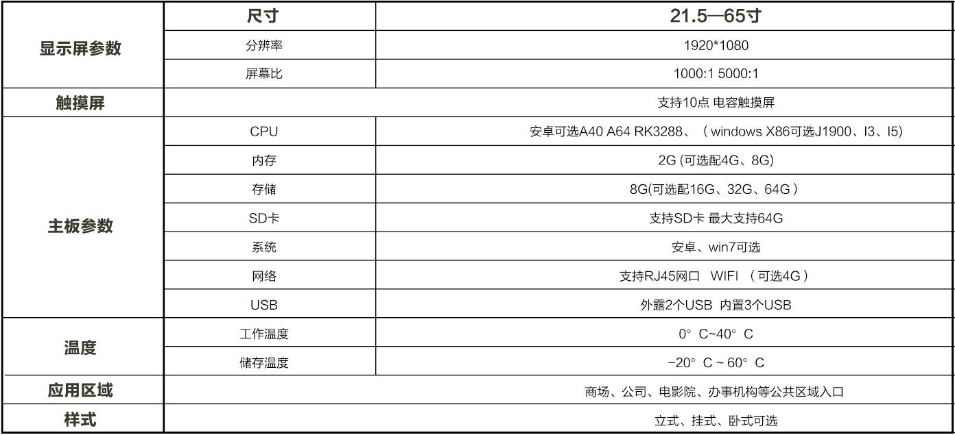 超薄機身;質(zhì)感拉絲金屬;高清畫質(zhì);觸摸極速反應;智能分屏;智能遠程信息發(fā)布;可定時開關機;提前設定節(jié)目源;鋼化玻璃屏幕;可定制專屬LOGO、多種顏色、尺寸可選。